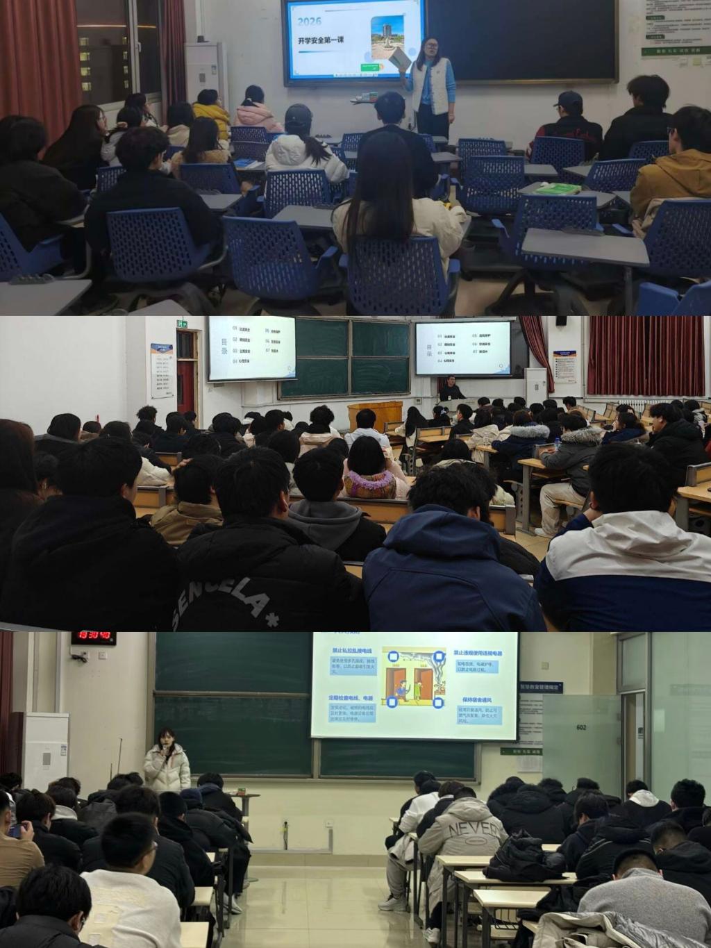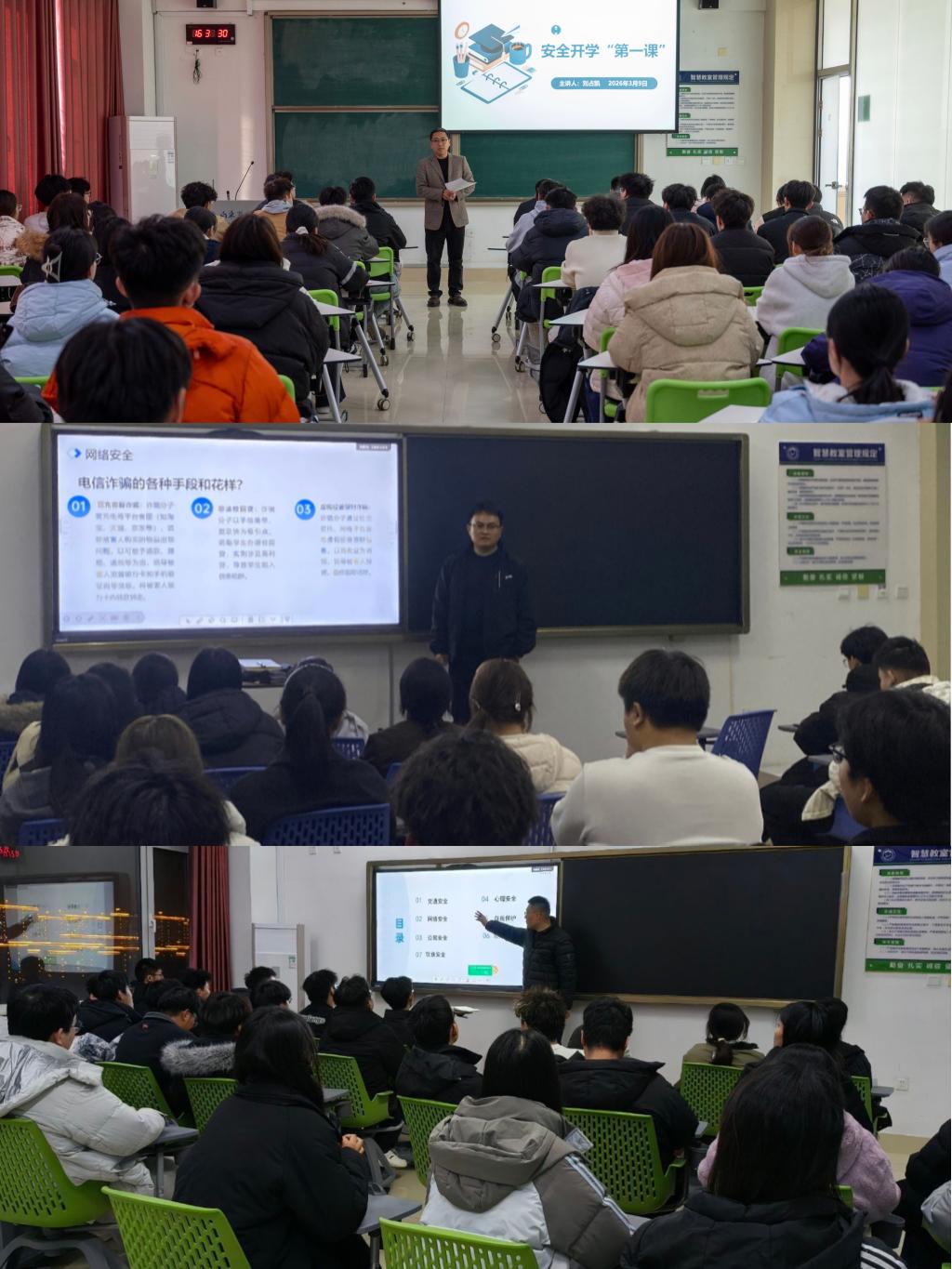 本次主题班会围绕交通、网络、公寓、心理、自我保护、饮食及防溺水等安全专题展开系统教育:通过剖析高校真实案例警示学生防范交通安全隐患;梳理高发及新型诈骗手段提升防诈识骗能力;结合案例讲解公寓火灾预防及逃生技巧;介绍心理健康标准及求助途径;强调运动安全和校园霸凌应对;引导学生养成良好饮食习惯;普及溺水识别与自救方法。老师们对七个专题的系统讲解,切实增强了学生的安全防范意识和应急处理能力。通过本次学习,同学们反响热烈,纷纷表示将进一步把安全牢记心中,时刻规范自身行为,做到警钟长鸣,持续提升自我保护能力,共同营造安全和谐的校园环境。