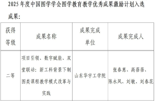 近日,中国图学学会发布2025年度教育教学优秀成果激励计划获奖名单。我院张春惠老师主持完成的《项目引领、数字赋能、双堂联动:新工科背景下制图类课程教学模式改革与实践》教学成果,成功入选优秀成果激励计划二等奖。